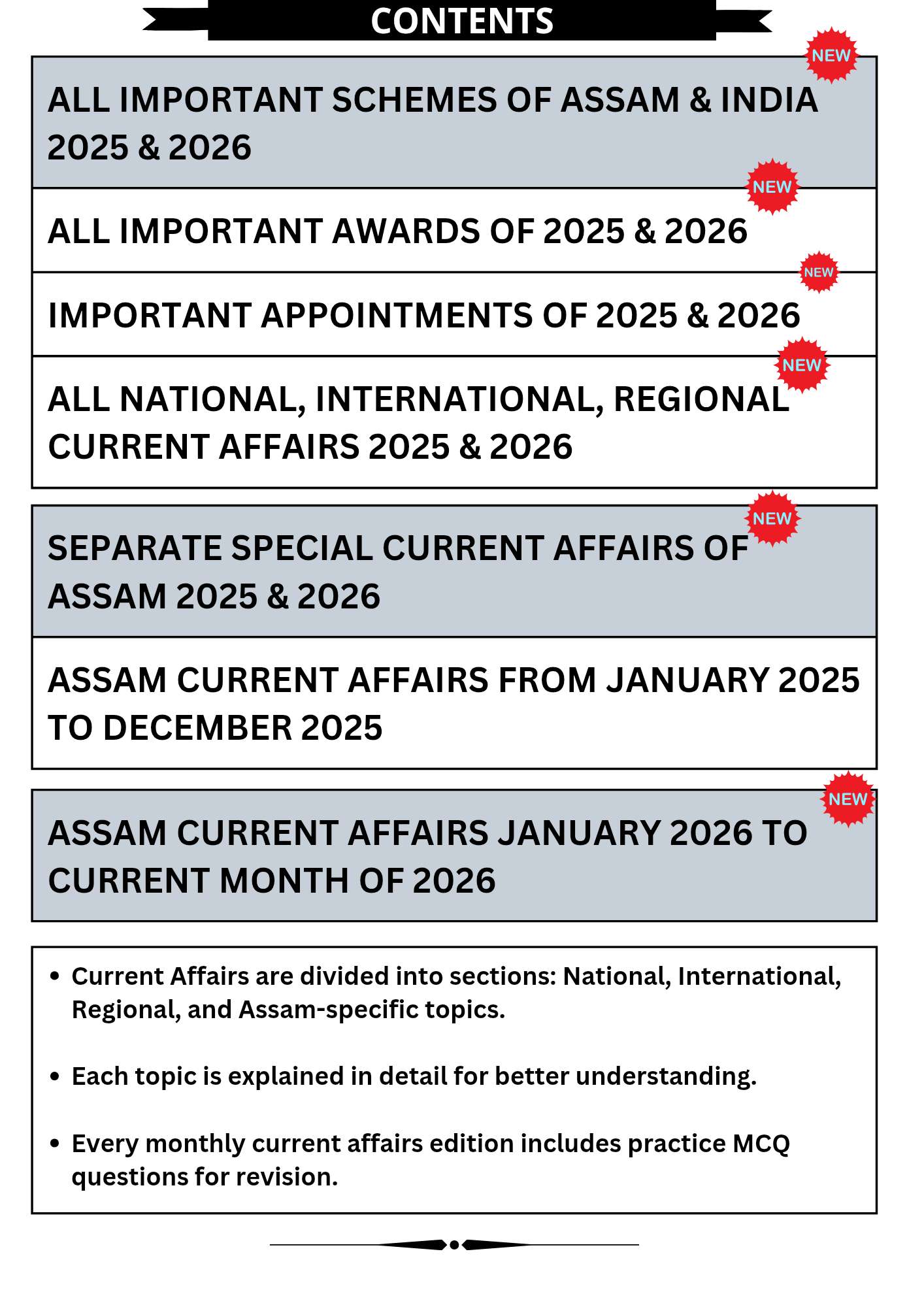 Our e-book covers all the significant Assam Current Affairs from January 2025 to February 2026, providing a thorough overview of key events and developments in the region. The content is meticulously organized into both MCQ and descriptive formats, ensuring a robust preparation tool for various exams including APSC, ADRE, Assam Police, and Assam TET.